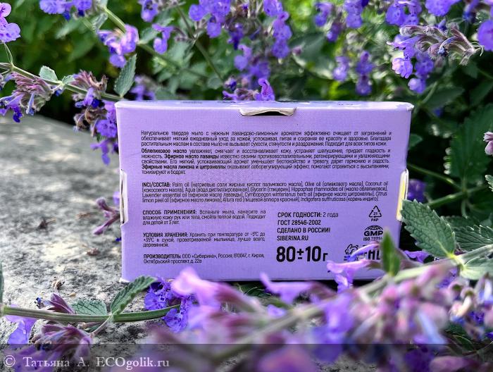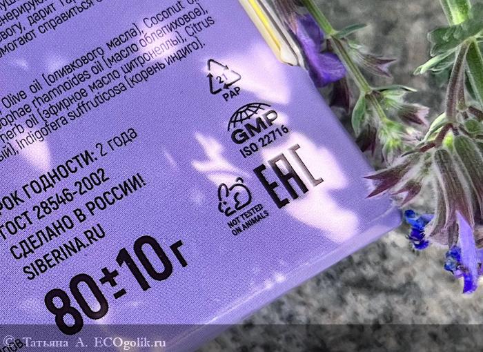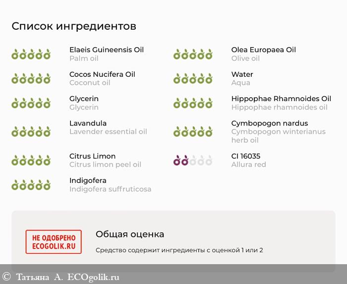 Palm oil (натриевые соли жирных кислот пальмового масла), Olive oil (оливкового масла), Coconut oil (кокосового масла), Aqua (вода дистиллированная), Glycerin (глицерин), Hippophae rhamnoides oil (масло облепиховое), Lavender essential oil (эфирное масло лаванды), Cymbopogon winterianus herb oil (эфирное масло цитронеллы), Citrus limon peel oil (эфирное масло лимона), Allura red (пищевой аллюра красный), Indigofera suffruticosa (корень индиго).