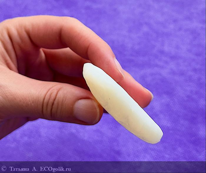 Мыло не идеальной ровной формы, с зазубринами и неровностями, характерными для натурального продукта. Использованию это нисколько не мешает — мыло комфортно лежит в руке и отлично скользит.