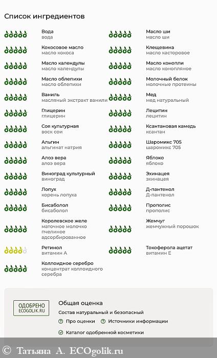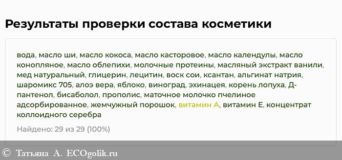 СОСТАВ: вода, масло ши, масло кокоса, масло касторовое, масло календулы, масло конопляное, масло облепихи, молочные протеины, масляный экстракт ванили, мед натуральный, глицерин, лецитин, воск сои, ксантан, альгинат натрия, шаромикс 705, экстракты (алоэ вера, яблока, косточки винограда, эхинацеи, корня лопуха), Д-пантенол, бисаболол, прополис, маточное молочко пчелиное адсорбированное, жемчужный порошок (экстракт), витамины: А, Е, концентрат коллоидного серебра.