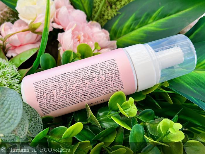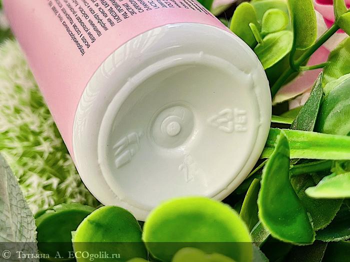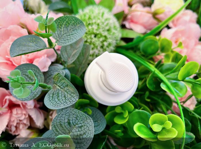 Первое, что приносит радость от средства, — это его внешний вид. Дизайн флакона стильный, утончённый, выполнен в мягком пудровом цвете. Смотрится женственно, элегантно, очаровательно! Очень приятно его не только созерцать, но и прикасаться к нему, тем более что этикетка тактильно очень приятная. Люблю, когда продукт прекрасен и внешне, и внутри — в последнем сомнений нет никаких, поскольку на флаконе красуется одобрительный штамп Ecogolik.ru.