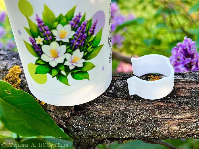 Посмотрим, каков гель-мусс в деле. Для начала снимем пластиковый фиксатор, который идёт в комплекте с флаконом и надёжно защищает его от случайного нажатия. Это колечко я не выбрасываю, а успешно использую во время поездок.
