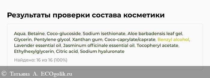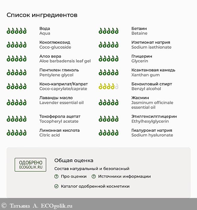 Aqua (вода дистиллированная), Betaine (бетаин), Coco-glucoside (кокоглюкозид), Sodium isethionate (изетионат натрия), Aloe barbadensis (aloe vera) leaf gel (гель алоэ вера), Glycerin (глицерин), Pentylene glycol* (пентилен гликоль), Xanthan gum (ксантановая камедь), Coco-caprylate/caprate (коко-каприлат/капрат), Benzyl alcohol (бензиловый спирт), Lavender essential oil (эфирное масло лаванды), Jasminum officinale essential oil (эфирное масло жасмина), Tocopheryl аcetate (витамин Е), Ethylhexylglycerin (этилгексилглицерин), Citric acid (лимонная кислота), Sodium hyaluronate (гиалуронат натрия). *изготовлен из багассы, получаемого из сахарного тростника.