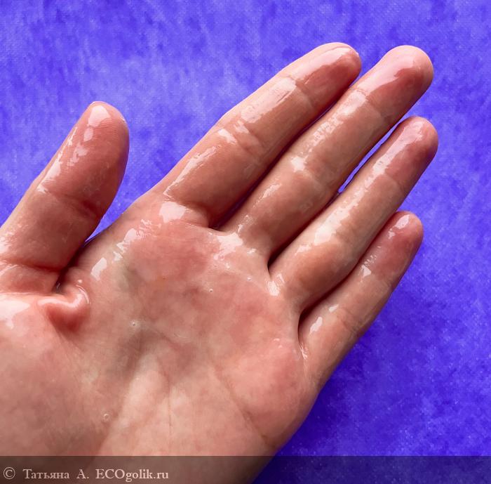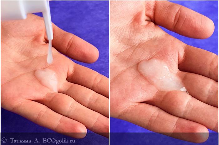 Качественный дозатор позволяет легко извлекать нужное количество средства, исключая перерасход. На коллаже ниже – порция, которой мне обычно хватает для однократного применения. Расход у гелевых текстур всегда экономичен.
