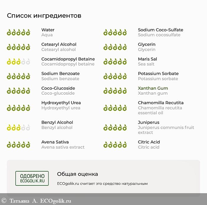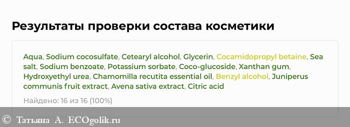 Aqua (вода дистиллированная), Sodium cocosulfate* (кокосульфат натрия), Cetearyl alcohol (цетилстеариловый спирт), Glycerin (глицерин), Cocamidopropyl betaine (кокамидопропилбетаин), Sea salt (соль морская), Sodium benzoate (бензоат натрия), Potassium sorbate (сорбат калия), Coco-glucoside (кокоглюкозид), Xanthan gum (ксантановая камедь), Hydroxyethyl urea (гидроксиэтил мочевина), Chamomilla recutita essential oil (эфирное масло ромашки), Benzyl alcohol (бензиловый спирт), Juniperus communis fruit extract (экстракт можжевельника), Avena sativa extract (экстракт овса), Citric acid (лимонная кислота).