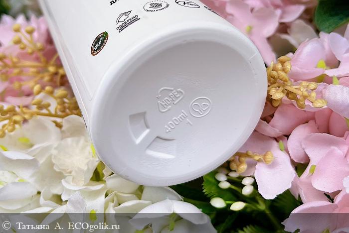 Флакон очень классно оформлен, в фирменном стиле бренда. На протяжении всего времени использования он радует глаз своим нежным дизайном, который ассоциируется с чистотой и свежестью. И будто бы даже сразу по упаковке понятно, что внутри что-то очень мягкое, молочно-кремовое.