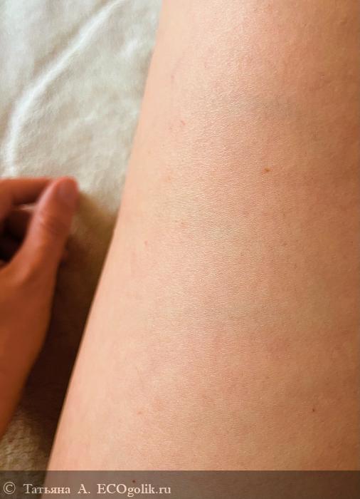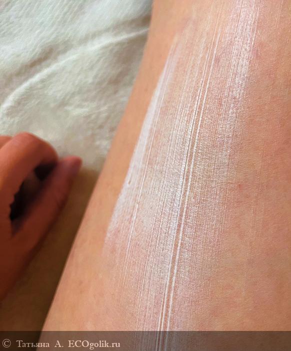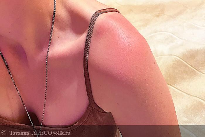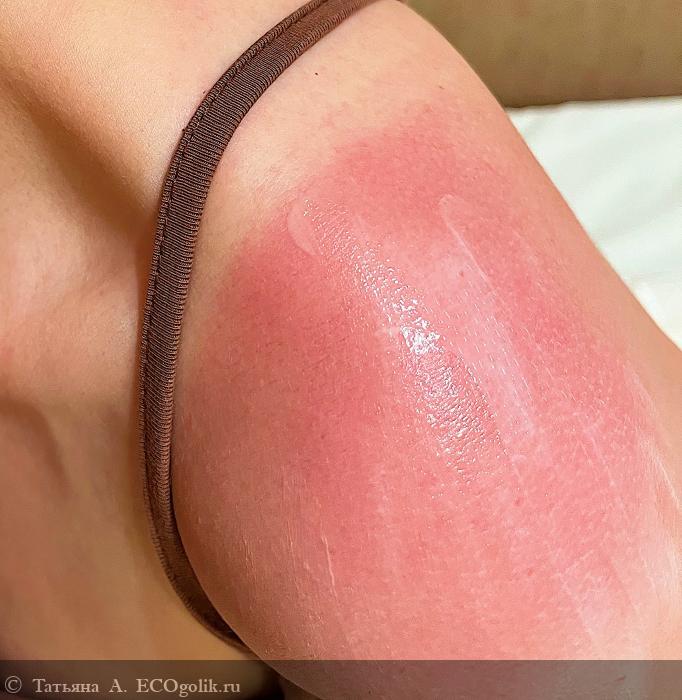 Он достаточно быстро подтаял и впитался без остатка. И очень скоро я стала ощущать, что жжение потихоньку сходит на нет. Обычно, когда я получаю солнечный ожог, ночью сплю беспокойно, потому что ворочаюсь и постоянно задеваю обгоревшее место, но в этот раз всё прошло благополучно.