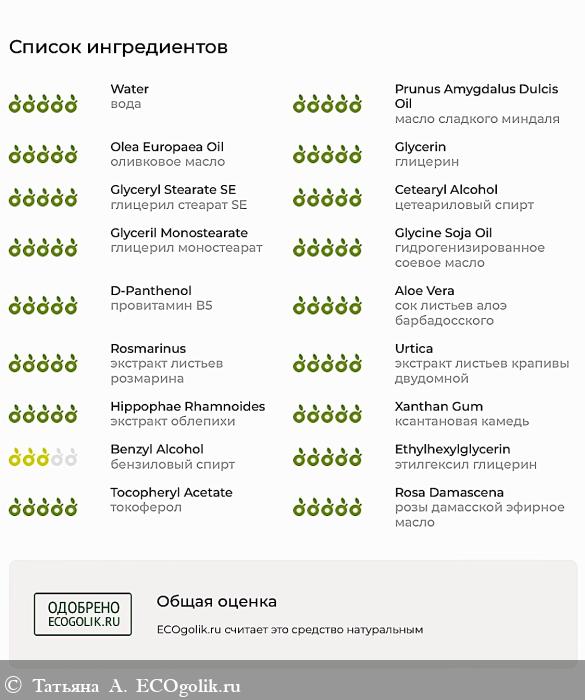 СОСТАВ: вода, масло сладкого миндаля, оливковое масло, глицерин, глицерил стеарат SE, цетеариловый спирт, глицерил моностеарат, гидрогенизированное соевое масло, провитамин В5, сок листьев алоэ барбадосского, экстракт листьев розмарина, экстракт листьев крапивы двудомной, экстракт облепихи, ксантановая камедь, бензиловый спирт, этилгексил глицерин, токоферол, розы дамасской эфирное масло.
