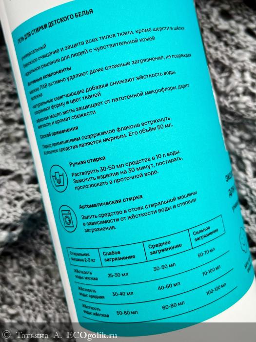 Это средство универсальное, подходит для всех типов тканей. Биоразлагаемая формула создана с заботой о здоровье и экологии. Гель безопасен для стирки белья не только взрослых, но и новорождённых детей.