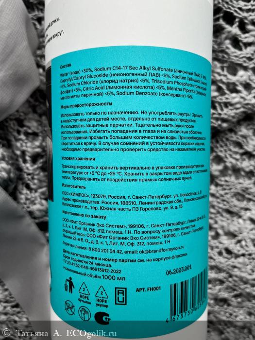 Состав (INCI): Water, Sodium C14-17 Sec Alkyl Sulfonate, Caprylyl/Capryl Glucoside <5%, Sodium Tallowate <5%, Sodium Chloride, Trisodium Phosphate, Citric Acid, Mentha Piperita, Sodium Benzoate <5%.