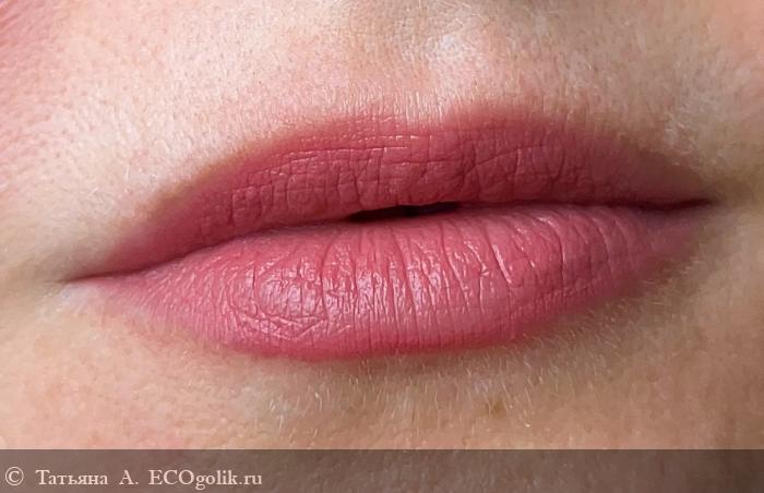 Бальзам хорош как самостоятельное средство, так и в качестве базы под макияж. Я взяла самую суровую из моих матовых помад, которая способна чуть ли не мгновенно превратить неподготовленные губы в засушливую пустыню, и протестировала, как она поведёт себя, будучи нанесённой на бальзам «Трюфель». Результат на фото, и он меня очень порадовал!