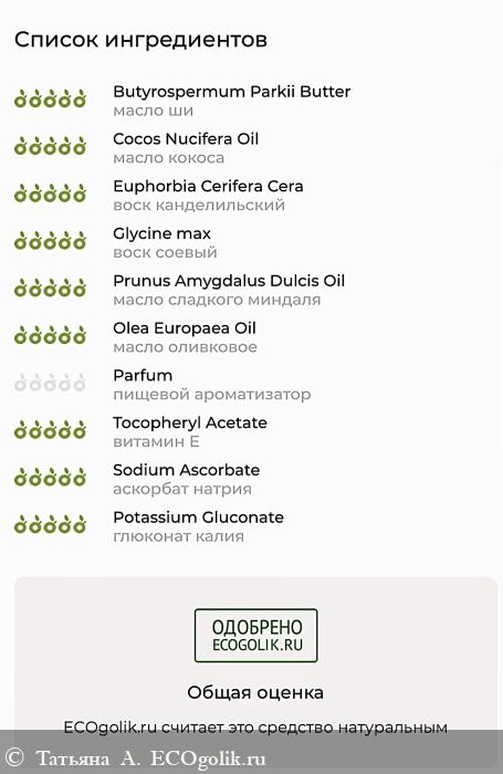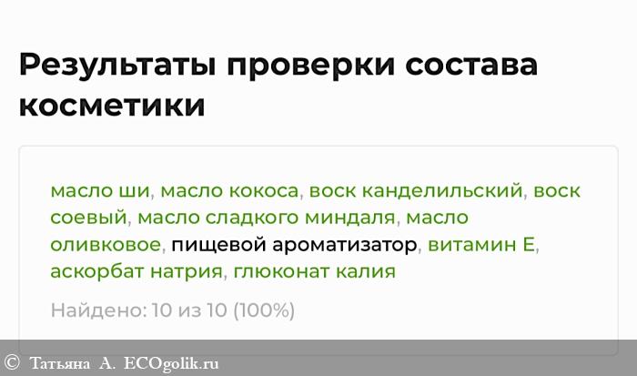 Сервис проверки Экоголик оценил высшим баллом каждый ингредиент средства и подтвердил его натуральность.
