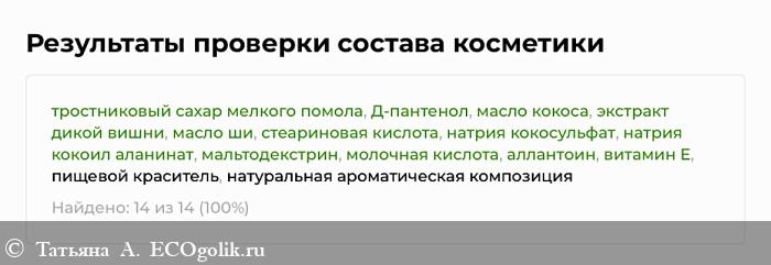 Все компоненты, кроме отдушки, получили от сервиса высший балл! На сайте производитель указывает, что использована натуральная ароматическая композиция с гипоаллергенным статусом, поэтому в плане безопасности средства можно быть спокойной.
