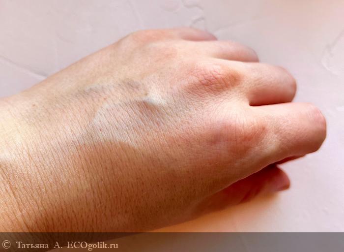 Текстура мягкая и податливая, напоминает чуть подтаявшее мороженое. В баночке след сохраняется до следующего использования.