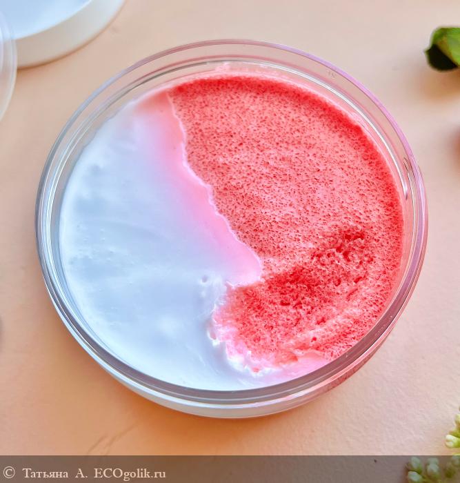 Крем-скраб с экстрактом дикой вишни бережно и деликатно удаляет ороговевший слой кожи. Этому способствует необычная консистенция средства, которая меня очаровала. Скраб состоит из двух несмешиваемых частей: кремовой и скрабирующей. Это не только красиво, но и очень приятно и деликатно.