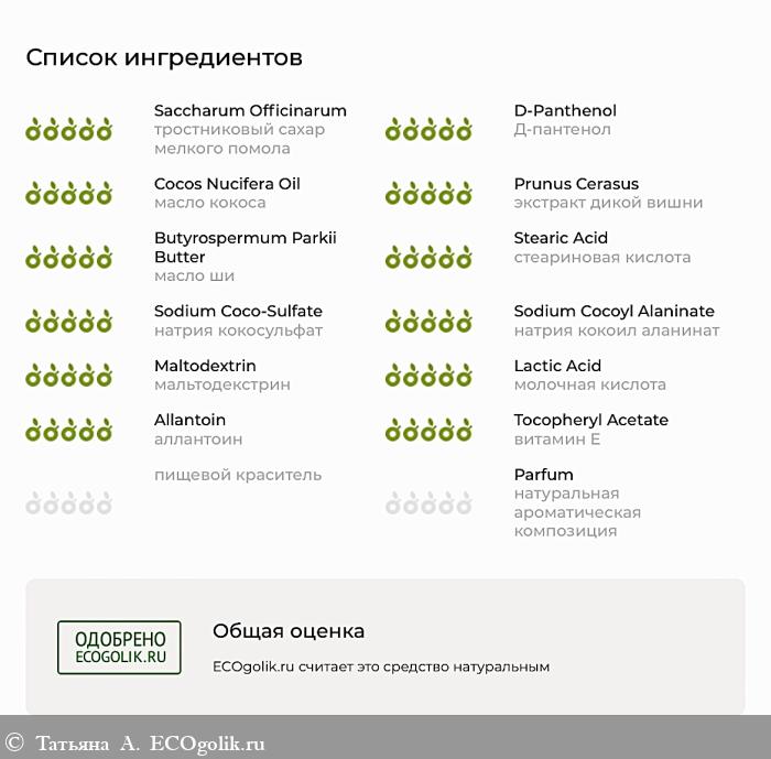 СОСТАВ: тростниковый сахар мелкого помола, Д-пантенол, масло кокоса (рафинированное), экстракт дикой вишни, масло ши, стеариновая кислота, натрия кокосульфат (кокосульфат натрия), натрия кокоил аланинат, мальтодекстрин, молочная кислота 80%, аллантоин, витамин Е, пищевой краситель, натуральная ароматическая композиция с гипоаллергенным статусом.