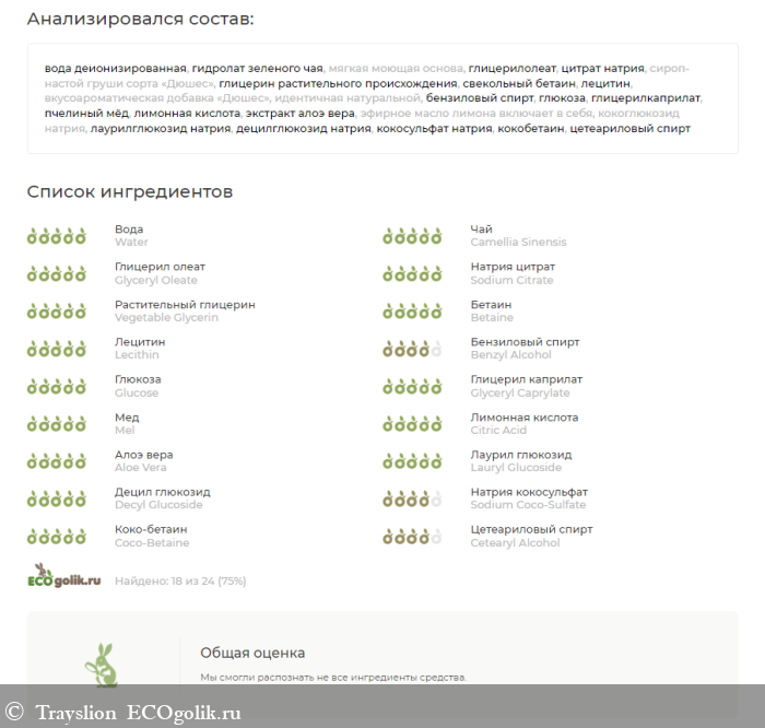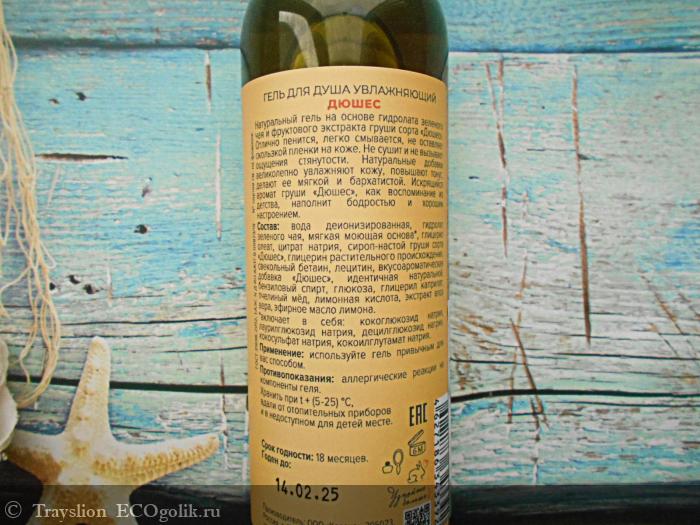 вода деионизированная, гидролат зеленого чая, мягкая моющая основа*, глицерилолеат, цитрат натрия, сироп-настой груши сорта «Дюшес», глицерин растительного происхождения, свекольный бетаин, лецитин, вкусоароматическая добавка «Дюшес», идентичная натуральной, бензиловый спирт, глюкоза, глицерилкаприлат, пчелиный мёд, лимонная кислота, экстракт алоэ вера, эфирное масло лимона.