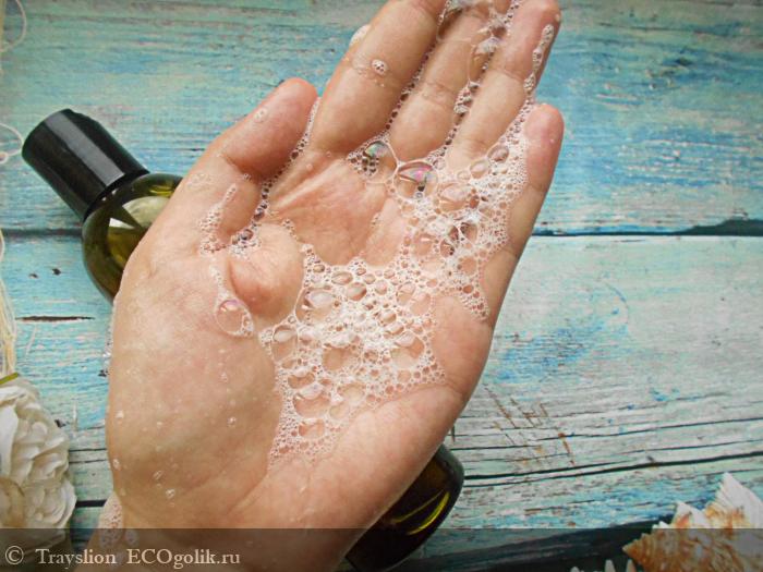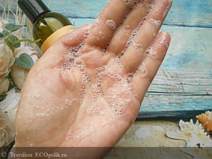 Без мочалки гель пенится умеренно, но с ней пены получается много - она упругая, пушистая и объёмная, долго не оседает.