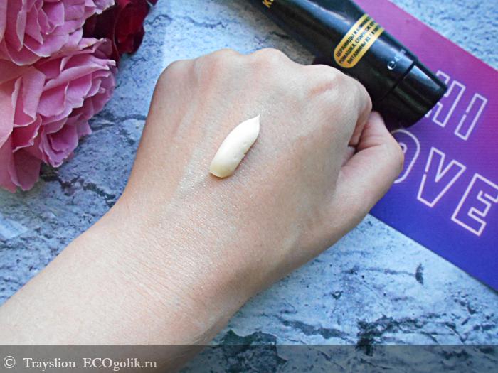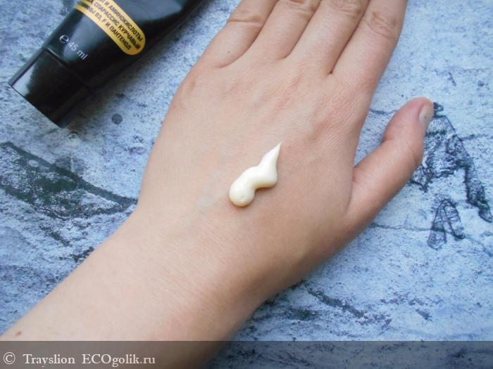 Консистенция у крема однородная, густая и в меру плотная. Капля превосходно держит форму и не растекается. При этом крем отлично поддаётся распределению по коже.