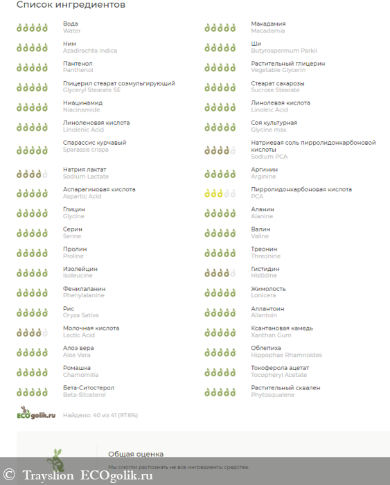 вода очищенная, масло рисовых отрубей, масло ореха макадамии, масло семян мелии азадирахта (дерево ним), масло карите, пантенол, глицерин2,3 (растительный), глицерил стеарат SE, стеарат сахарозы, ниацинамид (витамин В3), линолевая кислота3, линоленовая кислота3, церамид NG, экстракт семян сои, экстракт спарассиса курчавого3, натрий ПКК, натрия лактат, аргинин, аспарагиновая кислота, ПКК, глицин, аланин, серин, валин, пролин, треонин, изолейцин, гистидин, фенилаланин, экстракт жимолости душистой, экстракт жимолости японской, воск рисовых отрубей, аллантоин, молочная кислота, ксантановая камедь, экстракт алоэ вера, экстракт облепихи, экстракт ромашки, смесь токоферолов3, бета-ситостерол3, сквален3 (растительный).