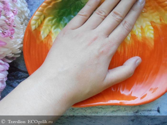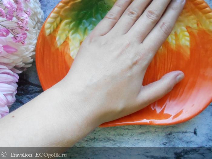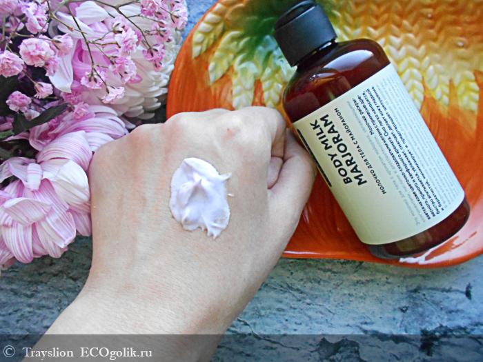 Молочко легко распределяется по коже тела. При втирании не полосит и не скатывается. Текстура не жирная и не липкая, по ощущениям будто воздушное суфле. После нанесения не оставляет жирного финиша, не ложится на кожу плёнкой.