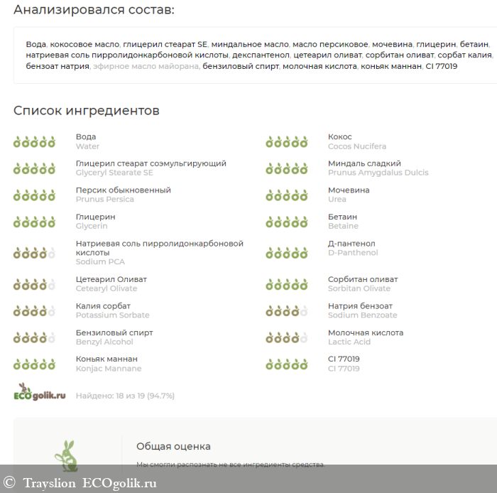 Вода, кокосовое масло, глицерил стеарат SE, миндальное масло, масло персиковое, мочевина, глицерин, бетаин, натриевая соль пирролидонкарбоновой кислоты, декспантенол, цетеарил оливат, сорбитан оливат, сорбат калия, бензоат натрия, эфирное масло майорана, бензиловый спирт, молочная кислота, коньяк маннан, CI 77019.