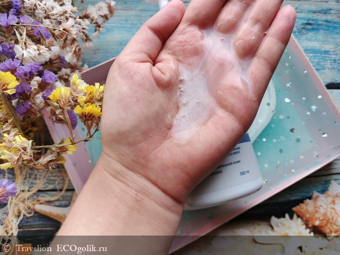 Гель кремообразный, с лёгкой перламутровостью. Текучий, но не слишком водянистый. Консистенция средней густоты и плотности. Тактильно очень нежная.