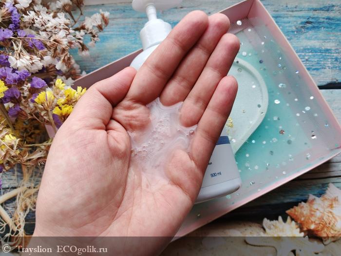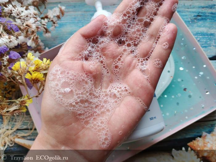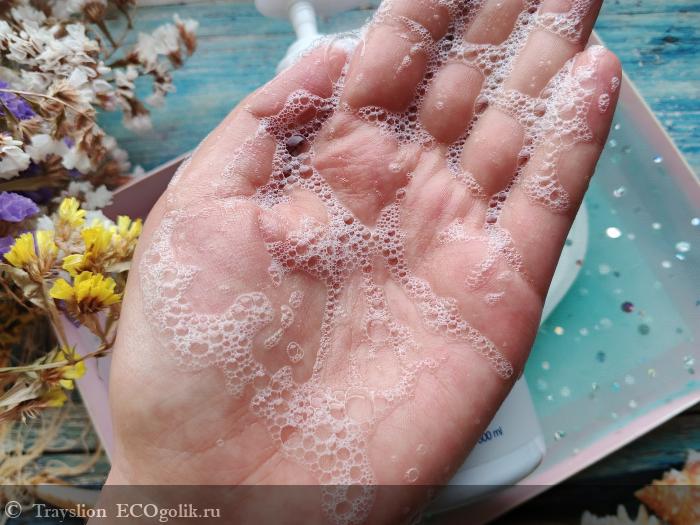 Чаще всего я использую гель совместно с мочалкой. Мне нравится то, что он не имеет резкого аромата. Пена мягко очищает кожу и легко смывается водой. Гель не раздражает кожу, не провоцирует сухость и появление воспалений. В холодное время года моя кожа часто сохнет, но после геля я ощущаю приятный увлажняющий эффект. Со своими функциями он полностью справляется, а именно очищает, ухаживает за кожей, легко смывается и не оставляет после себя липкости. Гель вполне подходит для ежедневного использования.