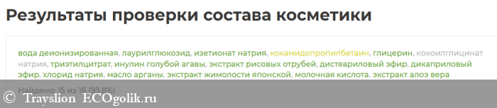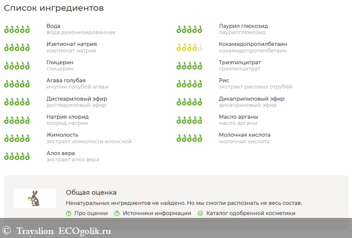 вода деионизированная, лаурилглюкозид, изетионат натрия, кокамидопропилбетаин, глицерин, кокоилглицинат натрия, триэтилцитрат, инулин голубой агавы (пребиотик), экстракт рисовых отрубей, дистеариловый эфир, дикаприловый эфир, хлорид натрия, масло арганы, экстракт жимолости японской, молочная кислота, экстракт алоэ вера.