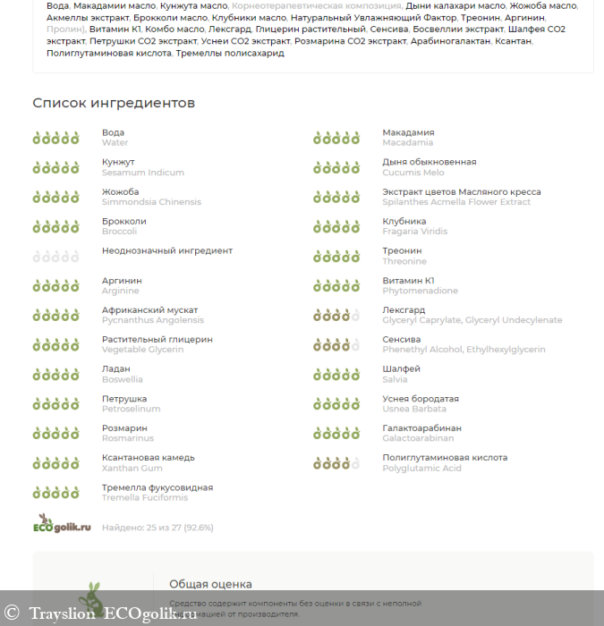 Вода, Макадамии масло, Кунжута масло, Корнеотерапевтическая композиция (Гидрированный фосфатидилхолин, Фитостеролы, Церамиды), Дыни калахари масло, Жожоба масло, Акмеллы экстракт (Каприлик/Каприловый триглицерид, Акмеллы цветов экстракт), Брокколи масло, Клубники масло, Натуральный Увлажняющий Фактор (Бетаин, Натрия РСА, Натрия лактат, Пирролидон карбоксилат, Серин, Аланин, Глицин, Глютаминовая кислота, Лизин (гидрохлорид), Треонин, Аргинин, Пролин), Витамин К1, Комбо масло, Лексгард (Глицерил каприлат, Глицерил ундециленат), Глицерин растительный, Сенсива (Фенилэтиловый спирт, Этилгексилглицерин), Босвеллии экстракт, Шалфея CO2 экстракт, Петрушки СО2 экстракт, Уснеи CО2 экстракт, Розмарина СО2 экстракт, Арабиногалактан (пребиотик), Ксантан, Полиглутаминовая кислота, Тремеллы полисахарид.