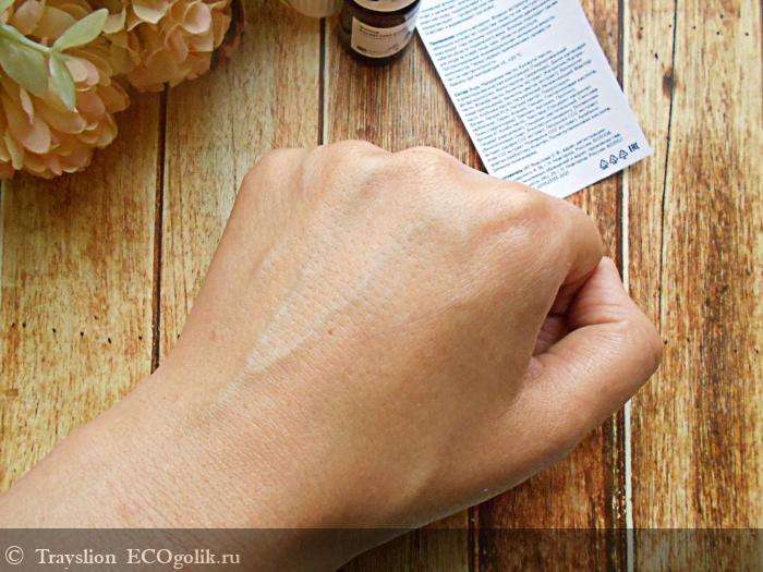 Флюид легко распределяется и не скатывается. Кожу не щиплет, не печёт и не вызывает покраснения. Впитывается не сразу, а спустя несколько минут. Оставляет слегка маслянистый финиш, но он мне не мешает. Но есть небольшой нюанс - глаза лучше не тереть, иначе флюид может их щипать.