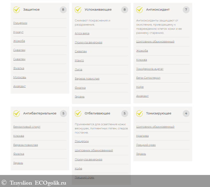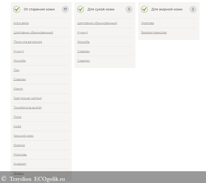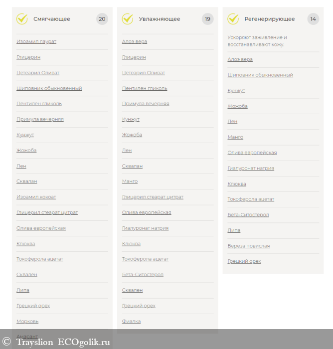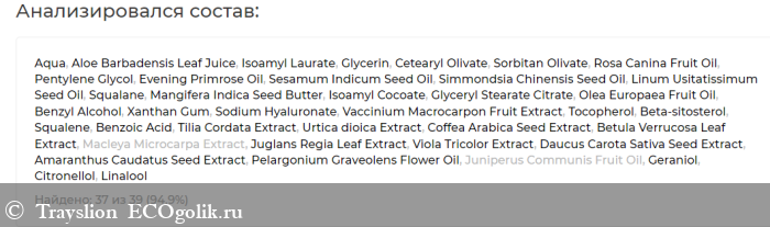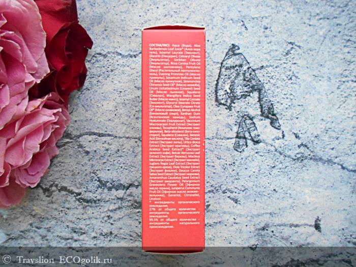 Aqua (Вода), Aloe Barbadensis Leaf Juice* (Алоэ вера гель), Isoamyl Laurate (Эмолент), Glycerin (Глицерин), Cetearyl Olivate (Эмульгатор), Sorbitan Olivate (Эмульгатор), Rosa Canina Fruit Oil (Масло шиповника), Pentylene Glycol (Растительный пентиленгликоль), Evening Primrose Oil (Масло примулы), Sesamum Indicum Seed Oil (Масло кунжутное), Simmondsia Chinensis Seed Oil* (Масло жожоба), Linum Usitatissimum (Linseed) Seed Oil (Масло льняное), Squalane (Сквалан), Mangifera Indica Seed Butter (Масло манго), Isoamyl Cocoate (Эмолент), Glyceryl Stearate Citrate (Со-эмульгатор), Olea Europaea Fruit Oil* (Масло оливковое), Benzyl Alcohol (Бензиловый спирт), Xanthan Gum (Ксантановая камедь), Sodium Hyaluronate (Гиалуронат), Vaccinium Macrocarpon Fruit Extract (Экстракт клюквы), Tocopherol (Комплекс токоферолов), Beta-sitosterol (Бета-ситостерол), Squalene (Сквален), Benzoic Acid (Бензойная кислота), Tilia Cordata Extract (Экстракт липы), Urtica dioica Extract (Экстракт крапивы), Coffea Arabica Seed Extract* (Экстракт зеленого кофе), Betula Verrucosa Leaf Extract (Экстракт березы), Macleya Microcarpa Extract (Экстракт маклейи), Juglans Regia Leaf Extract (Экстракт грецкого ореха), Viola Tricolor Extract (Экстракт фиалки), Daucus Carota Sativa Seed Extract (Экстракт моркови), Amaranthus Caudatus Seed Extract (Экстракт амаранта), Pelargonium Graveolens Flower Oil (Эфирное масло герани), Juniperus Сommunis Fruit Oil (Эфирное масло можжевельника), Geraniol, Citronellol, Linalool.