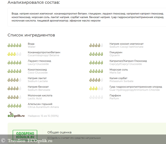 Вода, натрия кокоил изетионат, кокамидопропил бетаин, глицерин, лаурил глюкозид, каприлил каприл глюкозид, кокоглюкозид, морская соль, лактат натрия, сорбат калия, бензоат натрия, гуар гидроксипропилтримония хлорид, молочная кислота, пищевой ароматизатор, эфирное масло нероли.
