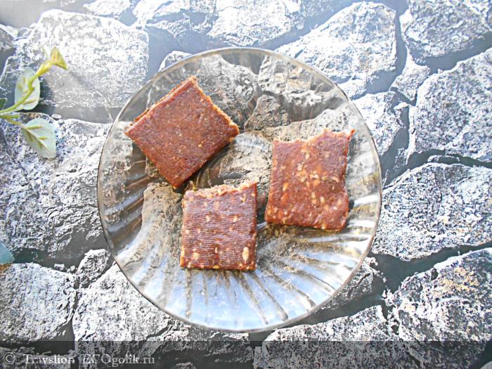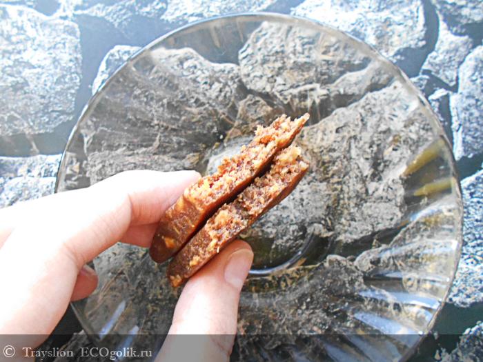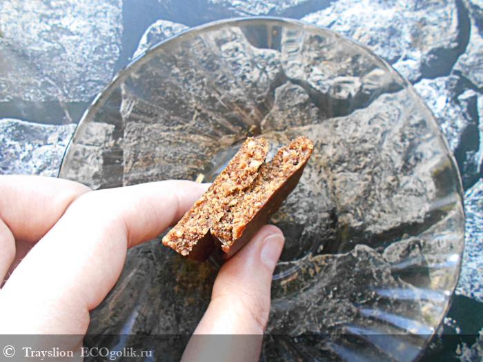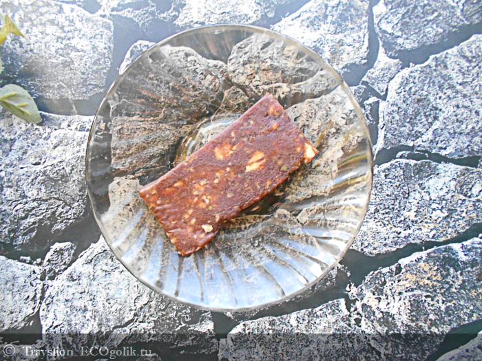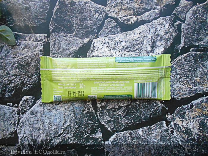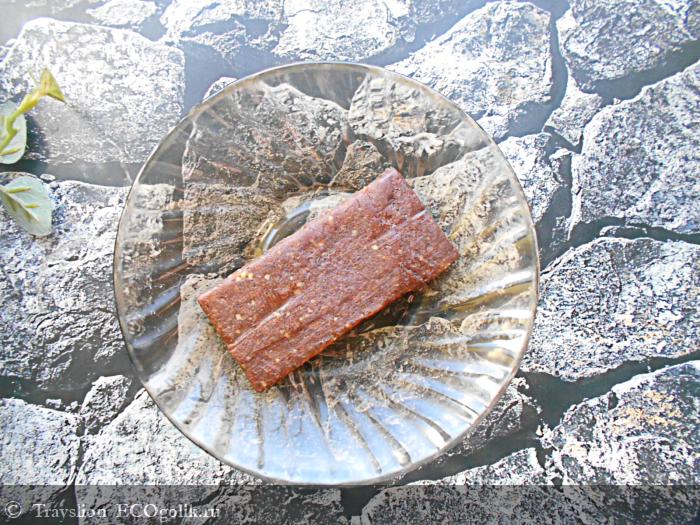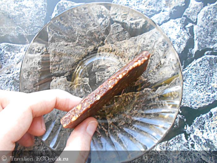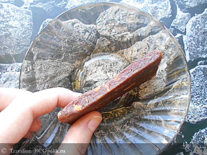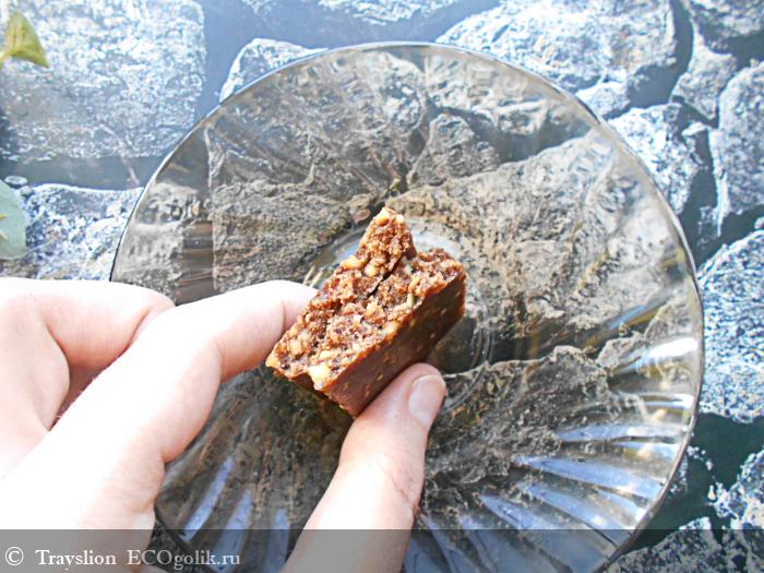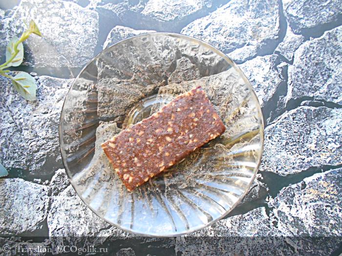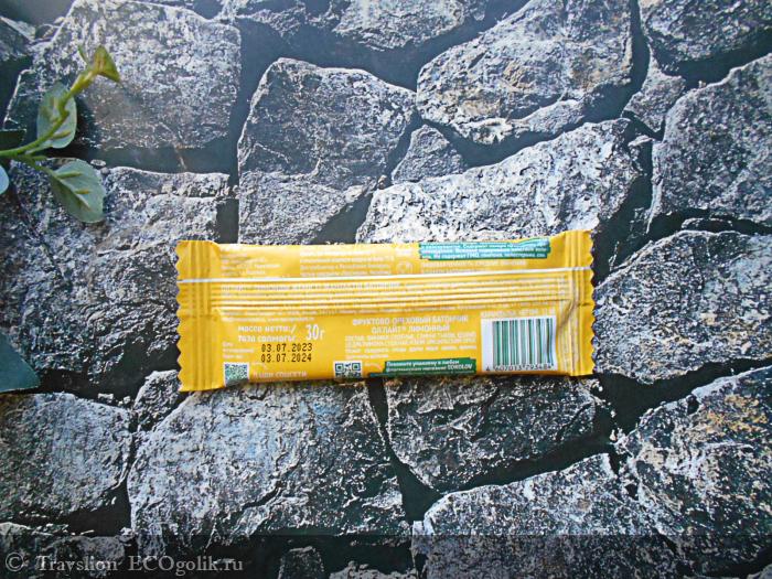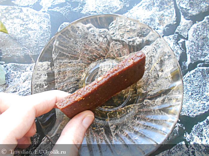 Мне он понравился больше всего. Сладость фиников удачно сочетается с чуть кисловатой цедрой лимона. Батончик не такой приторный, как остальные. Жуётся тоже легко, к зубам не липнет.