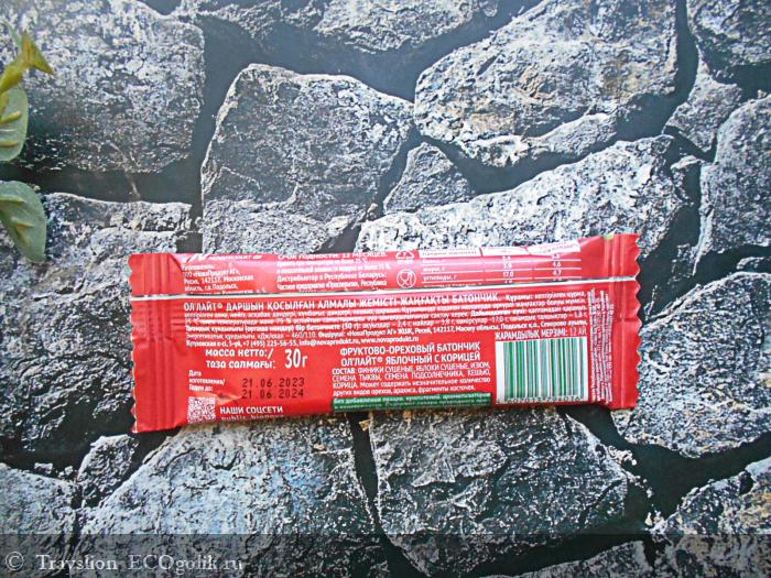 По структуре батончик плотный, но при этом мягкий и свежий. Легко жуётся и без проблем ломается на части. В текстуре видны вкрапления яблока, во вкусе отчётливо ощущается корица. На вкус батончик очень сладкий - даже приторный, его хочется запить водой. Оцениваю его на 4 балла.