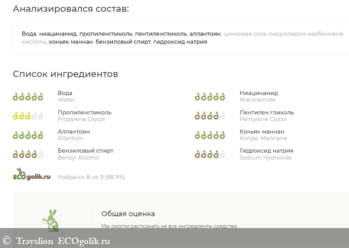 Вода, ниацинамид, пропиленгликоль, пентиленгликоль, аллантоин, цинковая соль пирролидон-карбоновой кислоты, коньяк маннан, бензиловый спирт, гидроксид натрия.