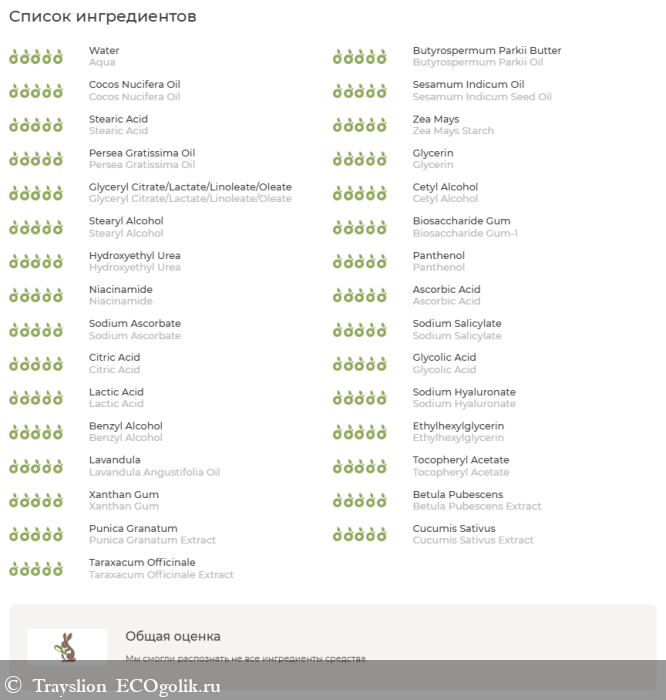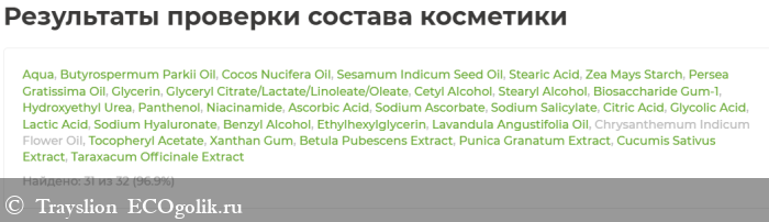 Крем насыщен питательными активами, маслами, экстрактами и витаминами, содержит натуральный увлажняющий фактор (НУФ), AHA-кислоты. В составе — только натуральные и безопасные компоненты, которые оценены сервисом проверки на 5 баллов.