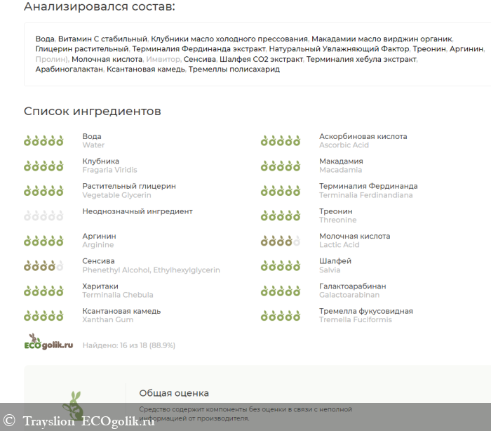 Вода, Витамин C cтабильный (Магния Аскорбил Фосфат), Клубники масло холодного прессования, Макадамии масло вирджин органик, Глицерин растительный, Терминалия Фердинанда экстракт (Глицерин, Вода, Экстракт Терминалия Фердинанда), Натуральный Увлажняющий Фактор (Бетаин, Натрия РСА, Натрия лактат, Пирролидон карбоксилат, Серин, Аланин, Глицин, Глютаминовая кислота, Лизин (гидрохлорид), Треонин, Аргинин, Пролин), Молочная кислота, Имвитор (Глицерил цитрат/лактат/линолеат/олеат), Сенсива (Фенилэтиловый спирт, Этилгексилглицерин), Шалфея CO2 экстракт, Терминалия хебула экстракт, Арабиногалактан, Ксантановая камедь, Тремеллы полисахарид.
