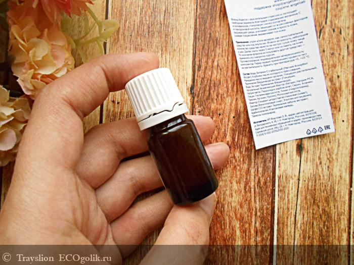 Форма выпуска - флакон из тёмного стекла с крышкой. У меня миниатюра 5 мл, которую хватило на 8 применений.