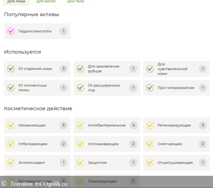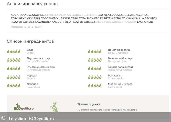 Из наиболее полезных компонентов можно отметить экстракт центеллы азиатской, ромашки, лаванды, череды, алоэ и токоферол. Все они успокаивают кожу и обладают противоспалительным эффектом.