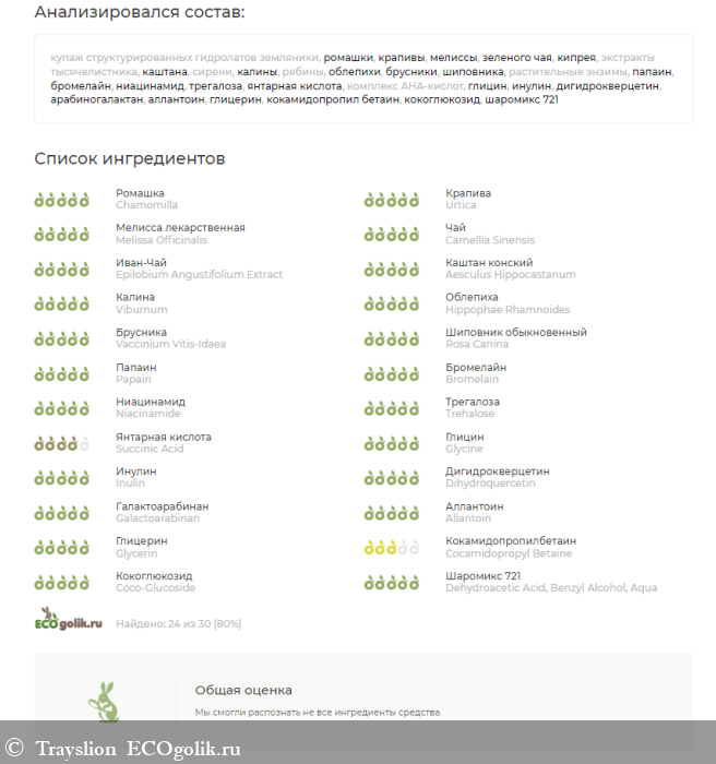 купаж структурированных гидролатов земляники, ромашки, крапивы, мелиссы, зеленого чая, кипрея; экстракты тысячелистника, каштана и сирени, калины, рябины, облепихи, брусники, шиповника; растительные энзимы: папаин, бромелайн, ниацинамид, трегалоза, янтарная кислота, комплекс AHA-кислот (яблочная кислота, лимонная кислота, глюконовая кислота, молочная кислота, аскорбиновая кислота, гликолевая кислота, салициловая кислота, винная кислота), глицин, инулин, дигидрокверцетин, арабиногалактан, аллантоин, глицерин, кокамидопропил бетаин, кокоглюкозид, шаромикс 721.