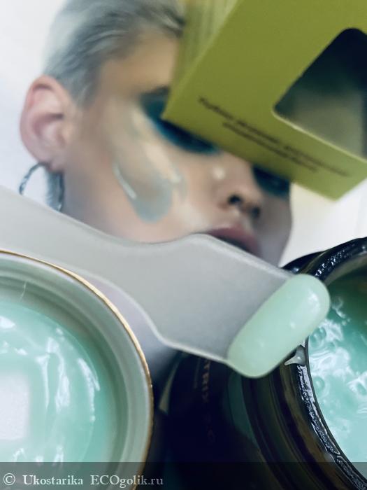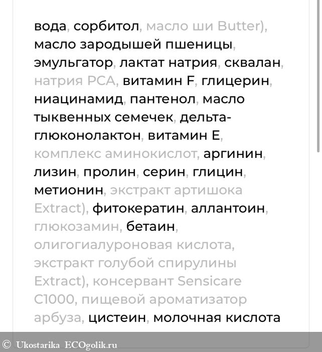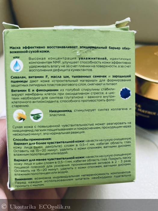 Состав : маска содержит достаточно большое количество растительных компонентов - экстракт артишока , голубой спирулины, масло ши, зародышей пшеницы, тыквенных семечек , присутствуют аминокислоты и витамины F, E. Очень люблю в уходовых средствах компонент ниацинамид, который благотворно влияет на кожу и способствует выработке коллагена и эластина. Стоит также отметить , что в составе присутствует компонент Phenoxyethanol, который может вызвать аллергическую реакцию.