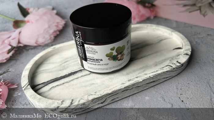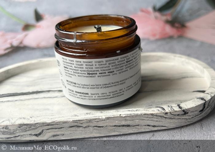 "Soy (soybean) wax (воск соевый), Nutmeg essential oil (эфирное масло мускатного ореха), Cedarwood siberian essential oil (эфирное масло кедра)."