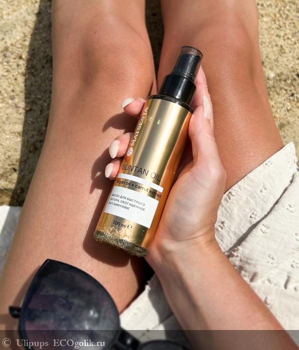 асло совершенно не липкое и довольно быстро впитывается, оставляет за собой легкий блеск коже, что даже очень красиво смотрится на уже загорелой коже.