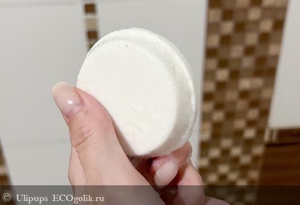 Внутри находится сам твёрдый шампунь. Он круглой формы, что удобно для намыливания.