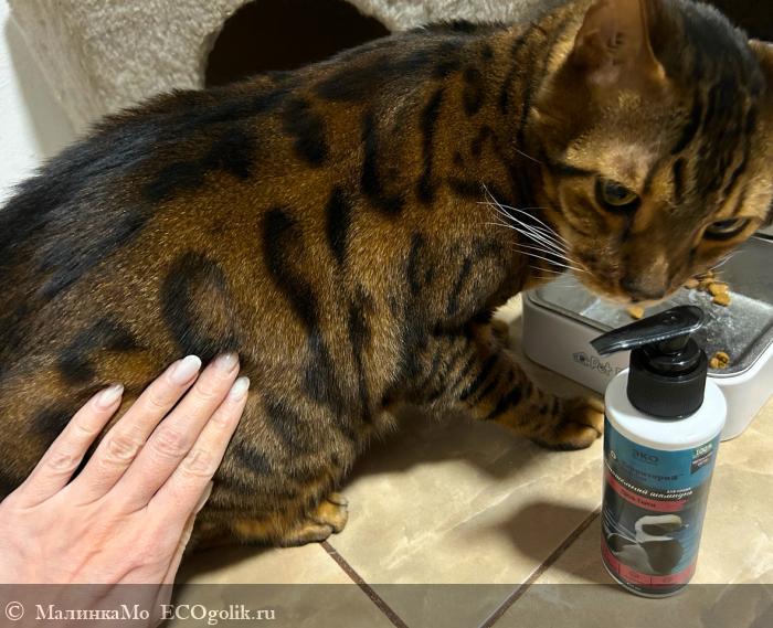 Не стала фотографировать котика в момент мытья, чтоб не напрягать его и не создавать тем самым стресс, так что в отзыве просто фото шампуня и котика с чистой и красивой золотистой шерсткой. Кстати такая расцветка у бенгалов называется "розетка в золоте".