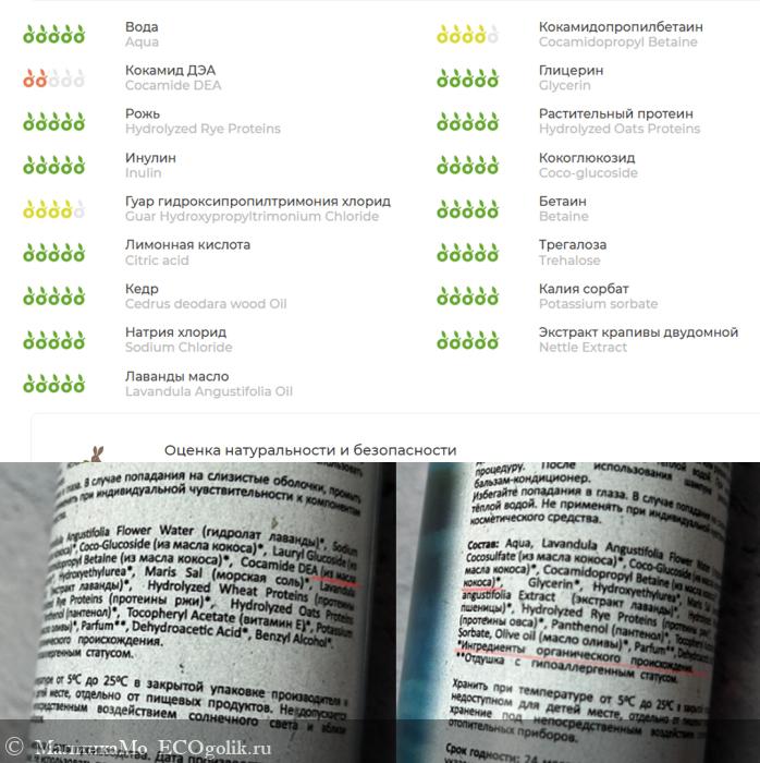 Aqua (природная вода), Cocamidopropyl Betaine (мягкий растительный ПАВ), Glycerin (растительный глицерин), Hydrolyzed Wheat Proteins (протеины пшеницы), Hydrolyzed Rye Proteins (протеины ржи), Hydrolyzed Oats Proteins (протеины овса), Inulin (инулин), Cocamide DEA (из масла кокоса), Guar Hydroxypropyltrimonium Chloride(катионный гуар), Betaine (бетаин), Citric acid (лимонная кислота), Trehalose (трегалоза), Cedrus deodara wood Oil (эфирное масло кедра), Potassium sorbate (калия сорбат), Sodium Chloride, Elecampane Root Extract (экстракт девясила), St. John's Wort Extract (экстракт зверобоя), Nettle Extract (экстракт крапивы), Lavandula Angustifolia Oil (эфирное масло лаванды).