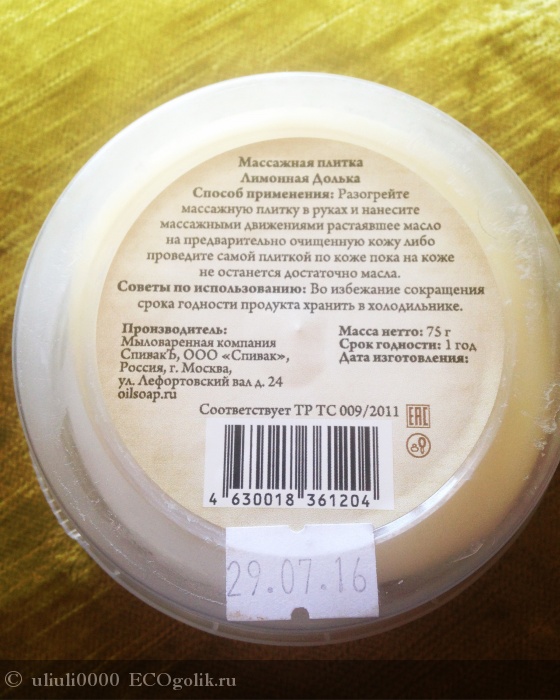 Способ применения: так как плитка в твердом виде, ее нужно разогреть в руках и нанести массажными движениями на предварительно очищенную кожу. Или можно провести самой плиткой по коже, пока на ней не останется достаточно масла. Изготовитель советует хранить продукт в холодильнике. Срок годности - 1 год. Но, поверьте, она не залежится на полочке, так как