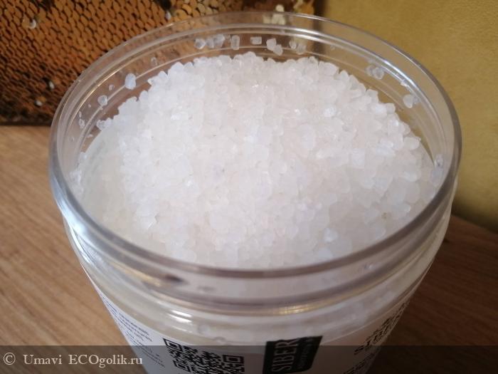 Соль крупного помола, но она прекрасно растворяется в горячей воде, распределяя аромат и придавая ванне приятное свойство.