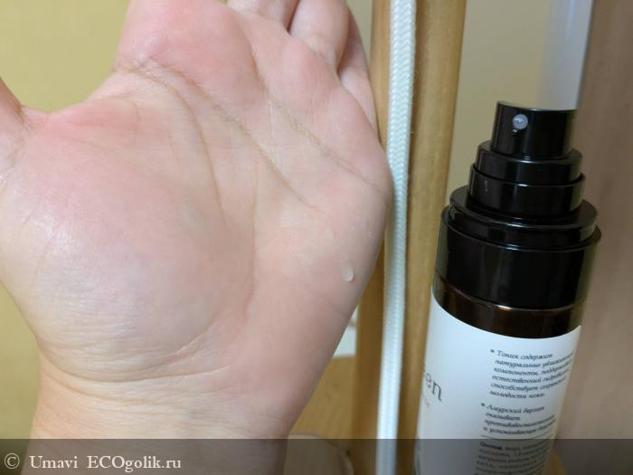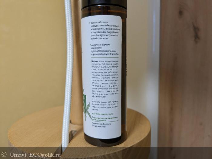 Состав мне понравился — здесь есть гиалуроновая кислота для увлажнения, алоэ вера и заявленный экстракт амурского бархата. Ничего лишнего, что могло бы раздражать кожу. Консистенция у тоника водянистая, как и должно быть, он не липнет и моментально впитывается. Запах очень легкий, нейтральный, чувствуется чуть пряный оттенок от экстракта, но он не навязчивый и сразу выветривается.