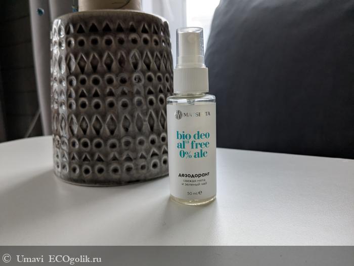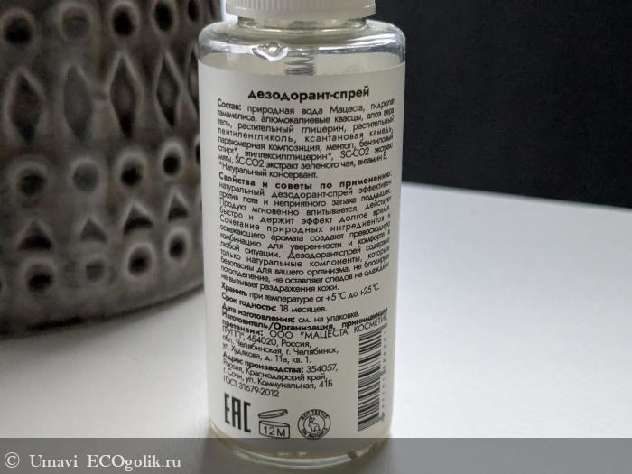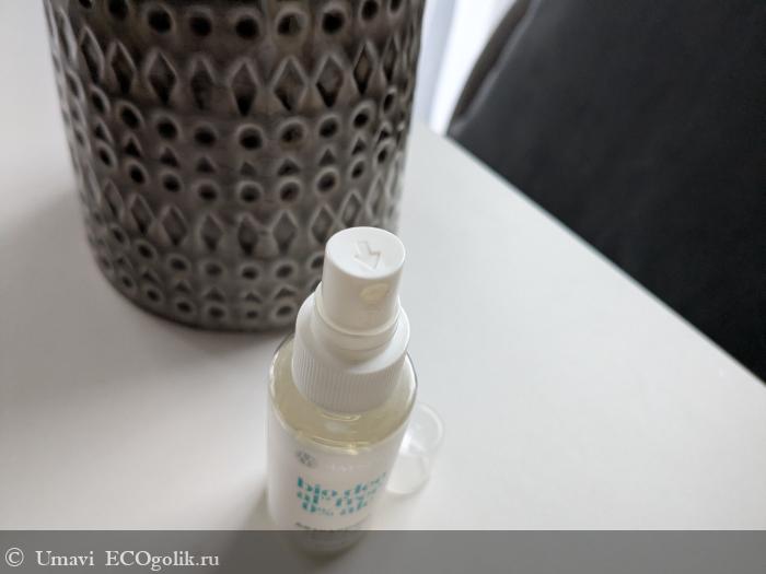 Флакон из прозрачного пластика с распылителем. Компактный, помещается в любую сумку. Распылитель работает ровно: нажим мягкий, облако среднее по плотности, покрывает подмышки с двух нажатий. Текстура водянистая, впитывается за 10–15 секунд, липкости не остается.